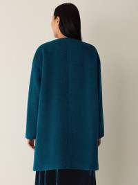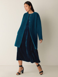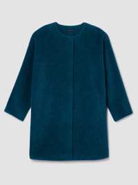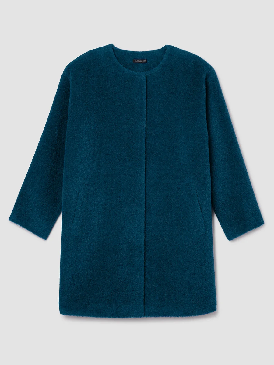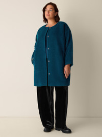 Plush boucle texture elevates a simple silhouette. The round neck coat with a snap button front and patch pockets, in a soft and sumptuous alpaca weave. Style No. F5AOP-C2170 DESIGN - Designed with a generous, boxy fit that drapes away from the body to create movement. - Only available at select EILEEN FISHER stores. - Kalyane is 5'10" and wears a size S in Ink, which measures 36 inches on the body. Size 1X measures 37 1/2 inches on the body. - Round neck, hidden placket with snap button front, drop shoulder. - Center back seam, front welt pockets. - Fully lined in Textured Satin made from Naia™ Renew cellulosic fiber. - Style No. F5AOP-C2170 FABRIC - A dimensional blend of wool and the long, lustrous fiber of the Suri alpaca—brushed and sheared for surface texture. Alpaca is a light and hollow fiber that adds warmth without weight. Spun, dyed and woven in Peru. - Dry clean only. - Made in Peru. 57% Wool RWS/38% Alpaca/5% Recycled Nylon. SUSTAINABILITY - Our wool supports ranchers who use better practices for animal welfare and land management.
