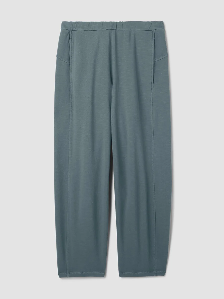 Elevated comfort. A relaxed ankle pant with a sculpted lantern shape and front pockets, in soft organic terry. Style No. S6BBR-P4846 DESIGN - Subtly curved through the leg, slightly tapered at the ankle. Fits the body with ease. - Only available online. - Ravyanshi is 5'8" and wears a size S in Wheat. Christina is 5'10" and wears a size 1X in Wheat. - 1-inch elastic waistband. - Side panel with on-seam pockets. - 11-inch rise; 27-inch inseam; 7 1/2-inch leg opening (size S). 13-inch rise; 27-inch inseam; 8 1/2-inch leg opening (size 1X). - Style No. S6BBR-P4846 FABRIC - Structured yet relaxed. Our terry is made with 100% organic cotton and garment dyed for a lived-in look. - Machine wash cold. Tumble dry low. - Made in Vietnam. 100% Organic Cotton. SUSTAINABILITY - Organic farming supports clean water and healthy soil.
