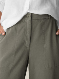 The arch pant. A modern silhouette with a relaxed barrel shape, in textural organic cotton. Made in a Fair Trade Certified™ factory. Style No. S6QVB-P4873 DESIGN - Subtle parallel curves create an arch shape through the leg, slightly tapered at the ankle. - Only available online. - Drew is 5'9" and wears a size XS in Papyrus. - 1 1/2-inch elastic waistband, belt loops, fly front with button and zipper closure. - Front slash pockets, darts at the knees. - 11-inch rise; 27-inch inseam; 8-inch leg opening (size XS). 11-inch rise; 25-inch inseam; 7-inch leg opening (size PS). 13-inch rise; 27-inch inseam; 9-inch leg opening (size 1X). - Style No. S6QVB-P4873 FABRIC - Inspired by workwear. A medium-weight textural weave with the softness of organic cotton. We dye the whole garment so that both the thread and fabric acquire a deep, saturated color. - Machine wash cold. Tumble dry low. Color transfer may occur. - Made in Indonesia. 100% Organic Cotton. SUSTAINABILITY - Our Fair Trade Certified™ factories meet rigorous social and environmental standards. By choosing Fair Trade Certified™ products, you’re helping to improve the lives of workers, build resilient communities and protect the environment. - Organic farming supports clean water and healthy soil.