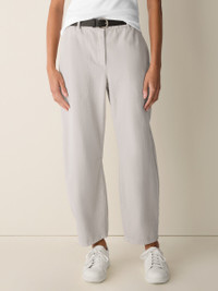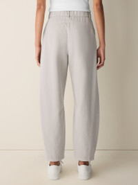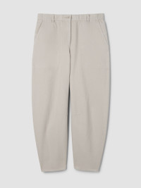 The arch pant. A modern silhouette with a relaxed barrel shape, in textural organic cotton. Made in a Fair Trade Certified™ factory. Style No. S6QVB-P4873 DESIGN - Subtle parallel curves create an arch shape through the leg, slightly tapered at the ankle. - Only available online. - Drew is 5'9" and wears a size XS in Papyrus. - 1 1/2-inch elastic waistband, belt loops, fly front with button and zipper closure. - Front slash pockets, darts at the knees. - 11-inch rise; 27-inch inseam; 8-inch leg opening (size XS). 11-inch rise; 25-inch inseam; 7-inch leg opening (size PS). 13-inch rise; 27-inch inseam; 9-inch leg opening (size 1X). - Style No. S6QVB-P4873 FABRIC - Inspired by workwear. A medium-weight textural weave with the softness of organic cotton. We dye the whole garment so that both the thread and fabric acquire a deep, saturated color. - Machine wash cold. Tumble dry low. Color transfer may occur. - Made in Indonesia. 100% Organic Cotton. SUSTAINABILITY - Our Fair Trade Certified™ factories meet rigorous social and environmental standards. By choosing Fair Trade Certified™ products, you’re helping to improve the lives of workers, build resilient communities and protect the environment. - Organic farming supports clean water and healthy soil.