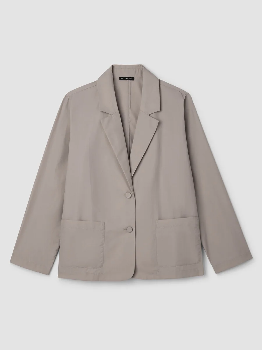 Practical yet polished. A sleek blazer with the subtle sheen of our cotton nylon weave, now made with recycled nylon. Style No. S6AKR-J5808 DESIGN - Close at the shoulders, wider at the hem. A silhouette that fits the body with ease. - Select colors may vary by store. - Kalyane is 5'10" and wears a size S in Dove, which measures 27 inches on the body. Haejin is 5'5" and wears a size PS in Dove, which measures 25 inches on the body. Ryan is 5'8" and wears a size 1X in Black, which measures 29 1/2 inches on the body. - Notch collar, button front, front patch pockets. - Center back seam with vent. - Style No. S6AKR-J5808 FABRIC - A sporty yet sophisticated weave. Our choice for lightweight outerwear since 2000. Now made with recycled nylon. - Machine wash cold. Line dry. - Made in Indonesia. 52% Organic Cotton/48% Recycled Nylon. SUSTAINABILITY - Recycled nylon keeps waste out of the landfill. It's part of our commitment to changing the way clothes are made.
