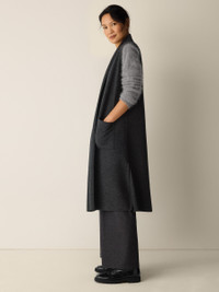 A warm layer with a touch of polish. The felted shawl collar vest with long lines and pockets, in 100% Responsible Wool Standard certified wool. Style No. F5BWQ-V1355 DESIGN - A generous, boxy fit that drapes away from the body to create movement. - Select colors may vary by store. - Kalyane is 5'10" and wears a size S, which measures 44 inches on the body. Size PS measures 40 inches on the body. Size 1X measures 45 1/2 inches on the body. - Shawl collar, sleeveless, open front. - Front patch pockets, 12-inch side slits. - Style No. F5BWQ-V1355 FABRIC - Our boiled wool with a soft, felted feel. The wool is not only responsibly sourced, it's helping to regenerate depleted grassland in Argentina with potential to sequester carbon and fight climate change. - Dry clean only. - Made in Vietnam. 100% Wool. SUSTAINABILITY - Our wool supports Argentinian ranchers who regenerate depleted grasslands through holistic farming methods while ensuring that better animal welfare practices are in place. - This fabric is bluesign® APPROVED. It's dyed with safer chemistry using less water and less energy, meeting the bluesign® CRITERIA.