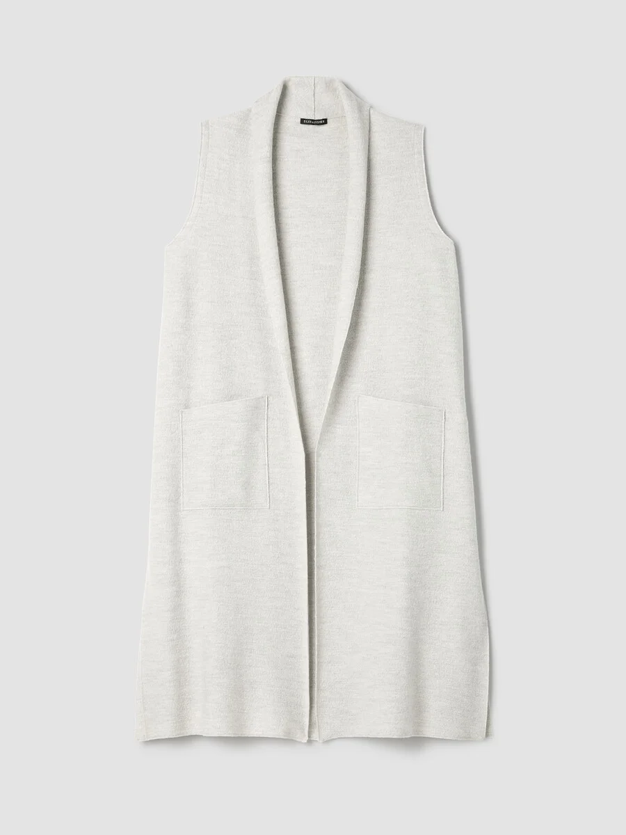 A warm layer with a touch of polish. The felted shawl collar vest with long lines and pockets, in 100% Responsible Wool Standard certified wool. Style No. F5BWQ-V1355 DESIGN - A generous, boxy fit that drapes away from the body to create movement. - Select colors may vary by store. - Kalyane is 5'10" and wears a size S, which measures 44 inches on the body. Size PS measures 40 inches on the body. Size 1X measures 45 1/2 inches on the body. - Shawl collar, sleeveless, open front. - Front patch pockets, 12-inch side slits. - Style No. F5BWQ-V1355 FABRIC - Our boiled wool with a soft, felted feel. The wool is not only responsibly sourced, it's helping to regenerate depleted grassland in Argentina with potential to sequester carbon and fight climate change. - Dry clean only. - Made in Vietnam. 100% Wool. SUSTAINABILITY - Our wool supports Argentinian ranchers who regenerate depleted grasslands through holistic farming methods while ensuring that better animal welfare practices are in place. - This fabric is bluesign® APPROVED. It's dyed with safer chemistry using less water and less energy, meeting the bluesign® CRITERIA.