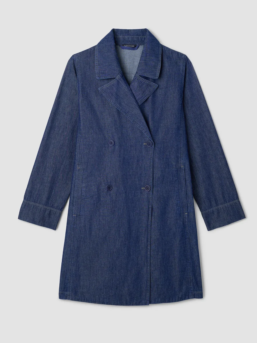 A modern take on the timeless trench. Designed with a notch collar and button front, in a fluid denim weave made from organic cotton. Style No. S6TUP-C2180 DESIGN - Close at the shoulders, wider at the hem. A silhouette that fits the body with ease. - Valerie is 5'9" and wears a size S, which measures 38 inches on the body. Size PS measures 35 inches on the body. Size 1X measures 39 1/2 inches on the body. - Notch collar, button front with corozo buttons. - Inverted back box pleat, welt pockets. - Style No. S6TUP-C2180 FABRIC - Denim made lighter. Organic cotton in a fluid weave that drapes and moves. - Machine wash cold. Tumble dry low. Color transfer may occur. - Made in Indonesia. 100% Organic Cotton. SUSTAINABILITY - Organic farming supports clean water and healthy soil.