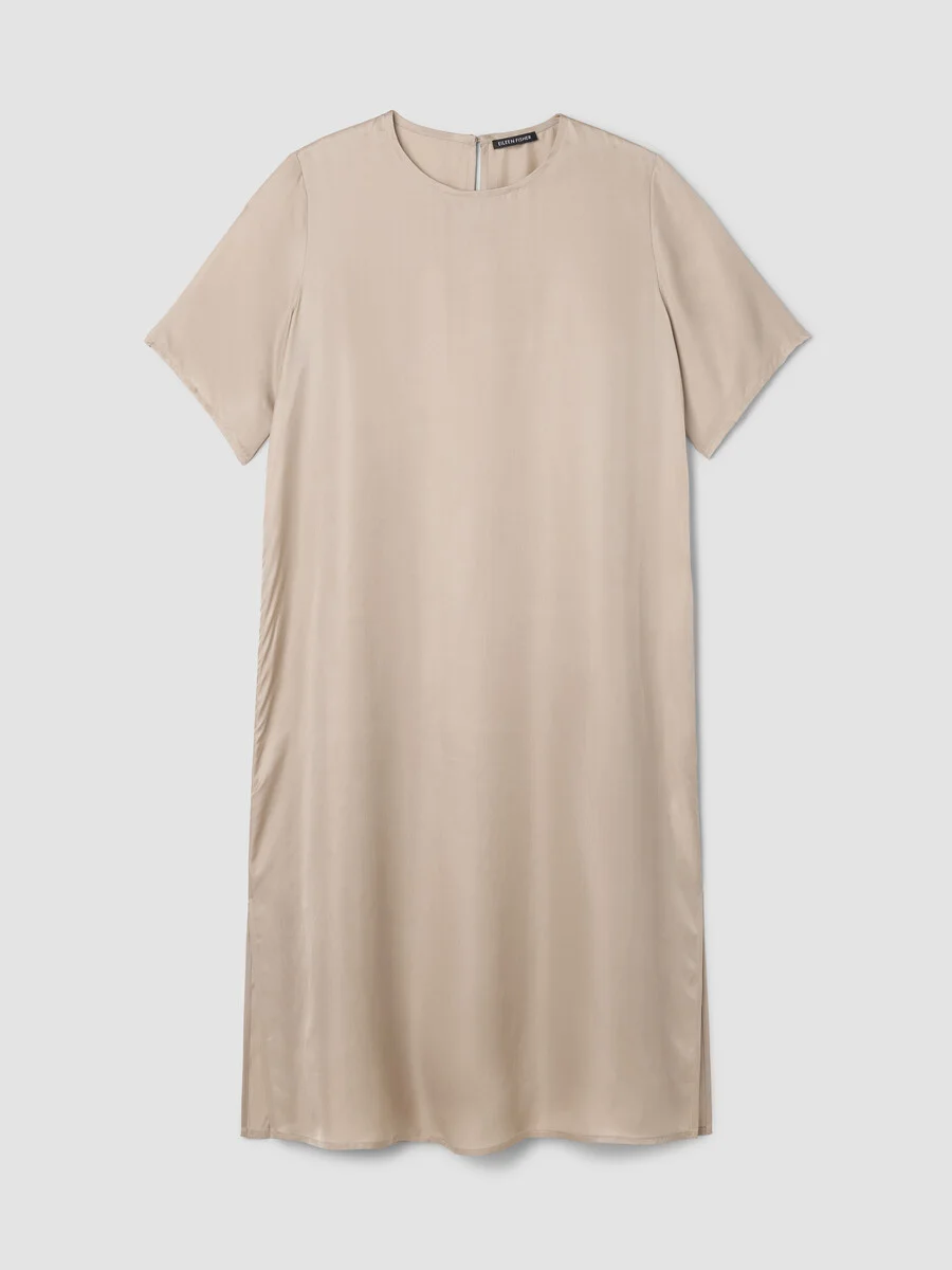 A simple silhouette elevated by lustrous texture. Designed with a round neck and dramatic side slits for movement, in a fluid satin weave. Style No. S6SVY-D5433 DESIGN - Close at the shoulders, wider at the hem. A silhouette that fits the body with ease. - Select colors may vary by store. - Kalyane is 5'10" and wears a size S in Field, which measures 45 inches on the body. Nina is 5'3" and wears a size PS in Field, which measures 42 inches on the body. Size 1X measures 46 1/2 inches on the body. - Round neck, short sleeves, 9-inch side slits. - Keyhole back closure with mother-of-pearl button. - Style No. S6SVY-D5433 FABRIC - Drapey satin with a smooth surface that catches the light. Made with Naia™ Renew cellulosic fiber produced in part with recycled material, helping keep waste out of landfills. - Turn inside out. Machine wash cold. Line dry. Do not steam. For best results, dry clean. - Made in Vietnam. 57% Naia™ Renew Acetate/43% Naia™ Acetate.