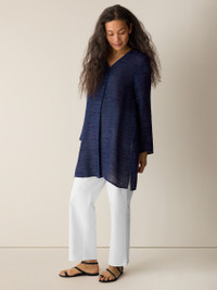 Relaxed and refined. A V-neck top with bracelet sleeves and dramatic side slits, in a breezy blend of organic linen and recycled nylon. Style No. S6RBR-T6460 DESIGN - Close at the shoulders, wider at the hem. A silhouette that fits the body with ease. - Only available at select EILEEN FISHER stores. - Valerie is 5'9" and wears a size S, which measures 35 inches on the body. Size 1X measures 36 1/2 inches on the body. - V-neck, button front, bracelet sleeves. - 12-inch side slits. - Mother-of-pearl buttons. - Style No. S6RBR-T6460 FABRIC - A gauzy, textural jacquard weave made from organic linen and recycled nylon. Woven with two colors of contrasting yarn for a subtle striated effect. - Dry clean only. - Made in Indonesia. 84% Organic Linen/16% Recycle Nylon. SUSTAINABILITY - Organic farming supports clean water and healthy soil.