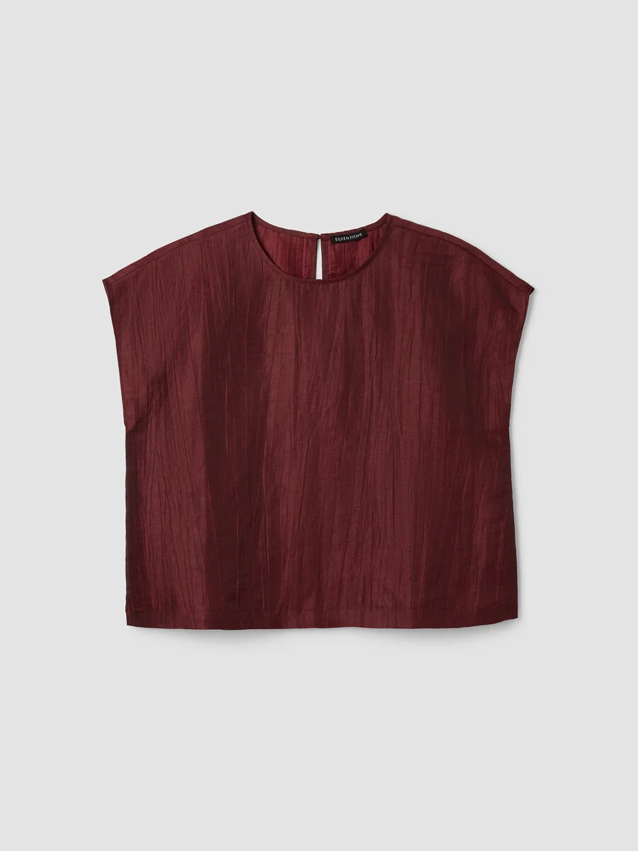 A sophisticated crinkle adds depth to an understated square top. Easy and effortless in organic linen with a hint of sheen. Style No. S6FWH-T5684 DESIGN - A generous, boxy fit that drapes away from the body to create movement. - Ravyanshi is 5'8" and wears a size XS in Kelp, which measures 22 inches on the body. Size 1X measures 24 1/2 inches on the body. - Round neck, cap sleeves. - Keyhole back closure with mother-of-pearl button. - Style No. S6FWH-T5684 FABRIC - A crinkled weave with the natural texture of organic linen. We add a touch of recycled nylon for sheen. - Machine wash cold. Line dry. - Made in Vietnam. 90% Linen/10% Nylon. SUSTAINABILITY - Organic farming supports clean water and healthy soil.