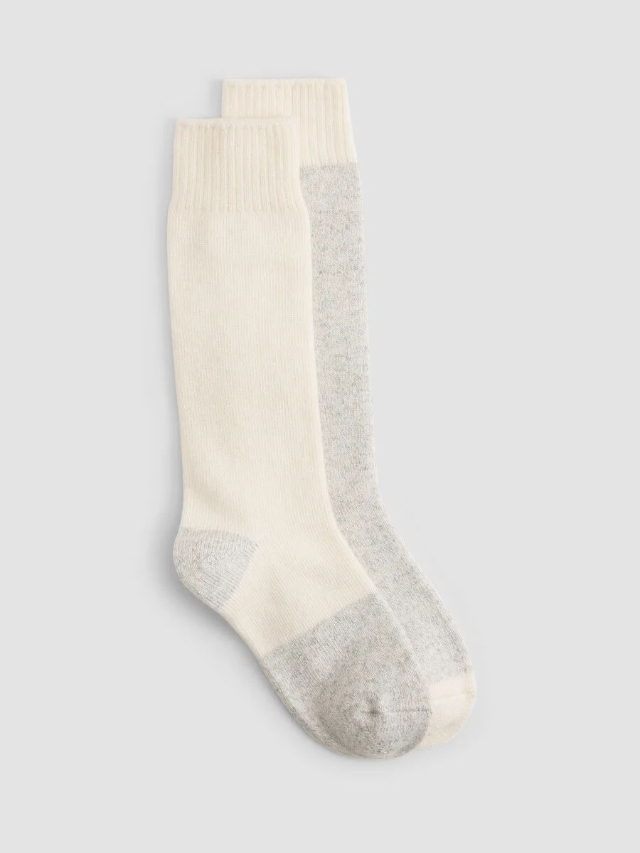 Two pairs of women's trouser socks with ribbed cuffs and color-blocking details. In our recycled nylon blend with a touch of cashmere and silk. Style No. F5MJZ-L0417 DESIGN - Nonbinding cuff for comfort; finished with hand-linked toe seams. - One size fits women's shoe sizes 6-10. - Style No. F5MJZ-L0417 - SKU: 198895143442 FABRIC - Comfort that understands luxury. We've added cashmere and silk to our blend of Tencel™ Lyocell and recycled nylon. Knit with a touch of spandex to help the socks stay in place. - Made in Thailand. SUSTAINABILITY - Tencel™ Lyocell is made from responsibly harvested trees.