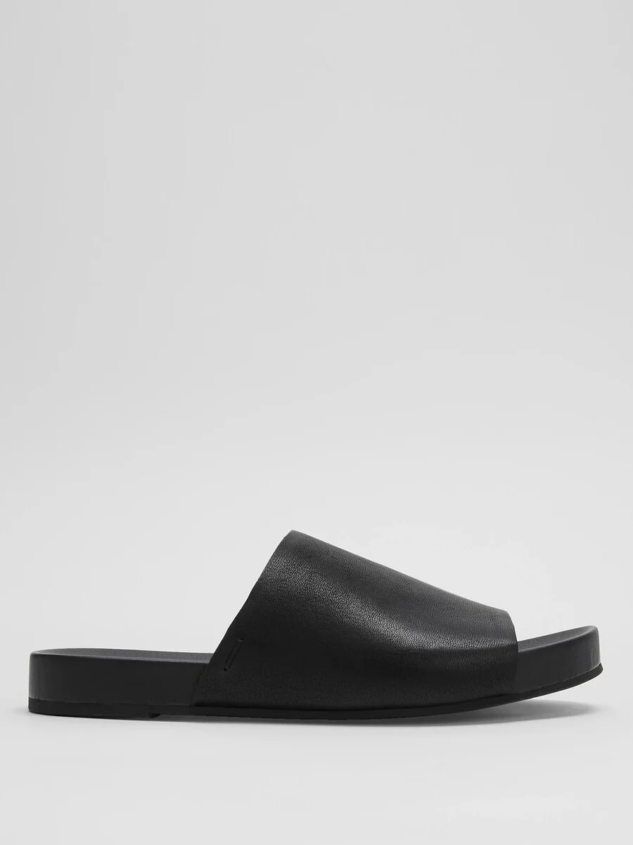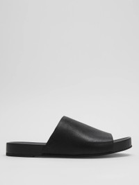 A streamlined slide sandal with a thick leather band and molded footbed. In soft tumbled leather. Style No. EF48385 DESIGN - Rubber outsole made in part with recycled rubber for comfort, flexibility and traction. - Honey only available online. - 1-inch heel with 1-inch platform; molded footbed for added support. - Open toe, single band styling; slip-on style. - Soft insole; leather lining. - Style No. EF48385 FABRIC - Tumbled leather upper. - Soft insole; leather lining. - Made in China. SUSTAINABILITY - Tumbled leather upper and leather lining are finished at an LWG Gold-Rated Tannery.