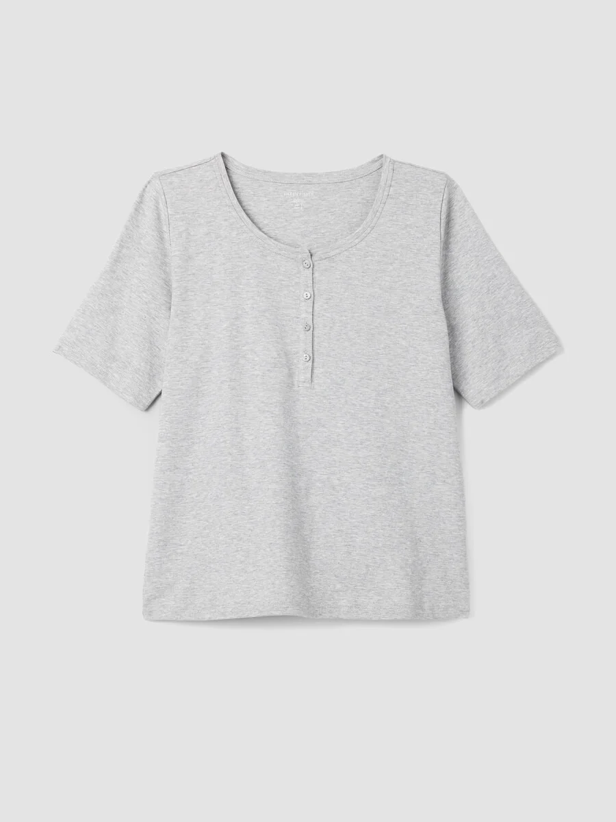 A relaxed sleep top with a henley button closure. In melange-dyed organic cotton that's grown using regenerative farming practices. Style No. SLANM-T945 DESIGN - Fits close to the body. Our slim fit is easier than the industry standard—with stretch for maximum comfort. - Only available online. - Size XS measures 23 1/2 inches on the body. Size 1X measures 26 1/2 inches on the body. - Short sleeves, 4-button henley closure. - River shell buttons. - Finished with banding at the neck. - Style No. SLANM-T945 FABRIC - A melange-dyed version of our organic cotton doubleknit. Now grown using regenerative farming methods that focus on soil health and biodiversity. - Machine wash cold. Tumble dry low. - Made in Peru. 100% Organic Cotton. SUSTAINABILITY - Organic farming supports clean water and healthy soil.