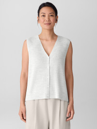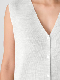 A timeless shape set apart by refined texture. The V-neck vest with a button front, in soft merino made with regenerative fiber. Style No. F5AIS-V1354 DESIGN - Close at the shoulders, wider at the hem. A silhouette that fits the body with ease. - Kalyane is 5'10" and wears a size S, which measures 22 1/2 inches on the body. Size 1X measures 25 inches on the body. - V-neck, sleeveless, button front. - Mother-of-pearl buttons. - Style No. F5AIS-V1354 FABRIC - Our signature merino yarns, with the quality we've counted on for more than two decades. The wool is not only responsibly sourced, it's helping to regenerate depleted grassland in Argentina with potential to sequester carbon and fight climate change. - Hand wash cold. Do no wring. Gently squeeze or roll in towel to remove excess moisture, reshape and lay flat to dry. May snag on jewelry. - Made in Cambodia. 100% Extra Fine Merino Wool. SUSTAINABILITY - Our wool supports Argentinian ranchers who regenerate depleted grasslands through holistic farming methods while ensuring that better animal welfare practices are in place.