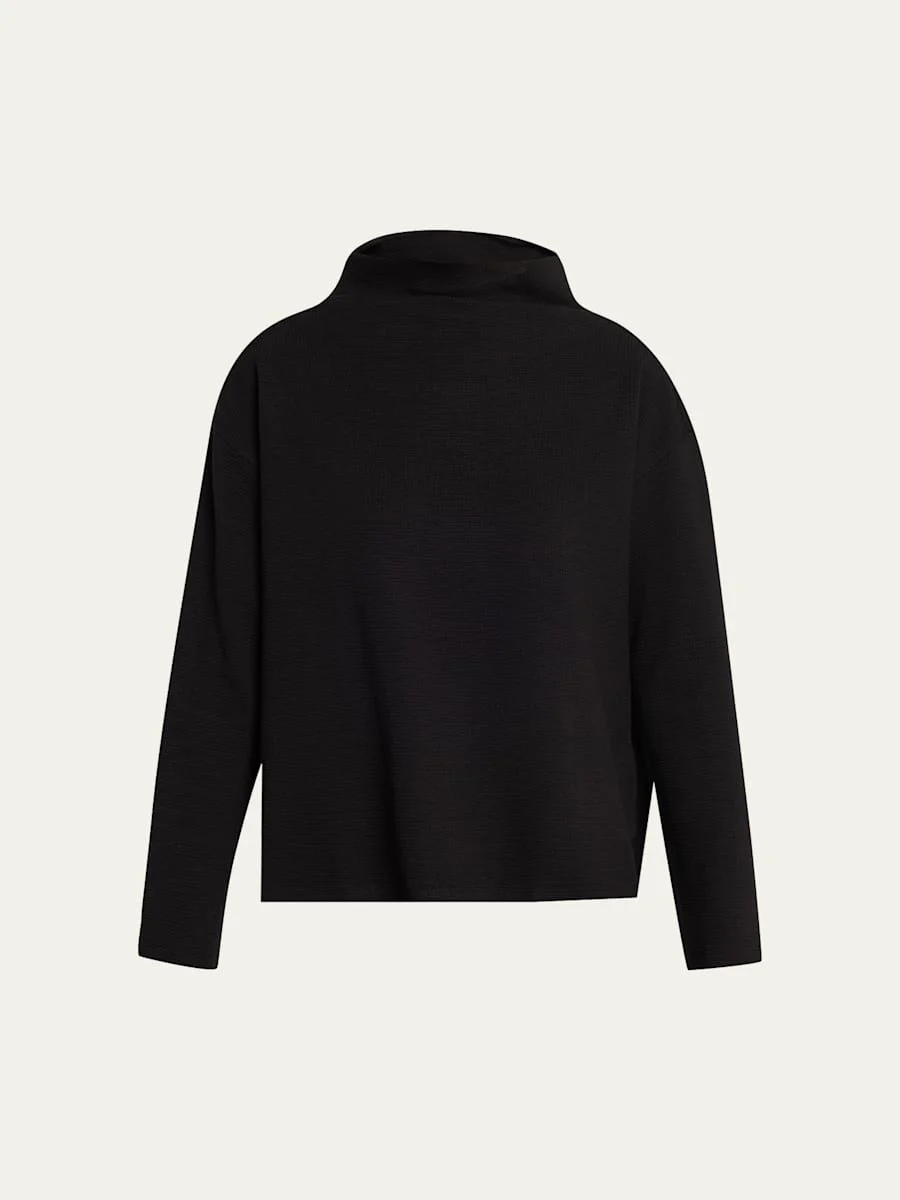 Eileen Fisher "Missy" cozy doubleknit sweater, defined by a waffle texture on the outside and a smooth surface on the inside. Approx. 25"L from shoulders to hem Funnel neckline Long sleeves Relaxed fit Slipon closure Cotton/Tencel® lyocell Imported