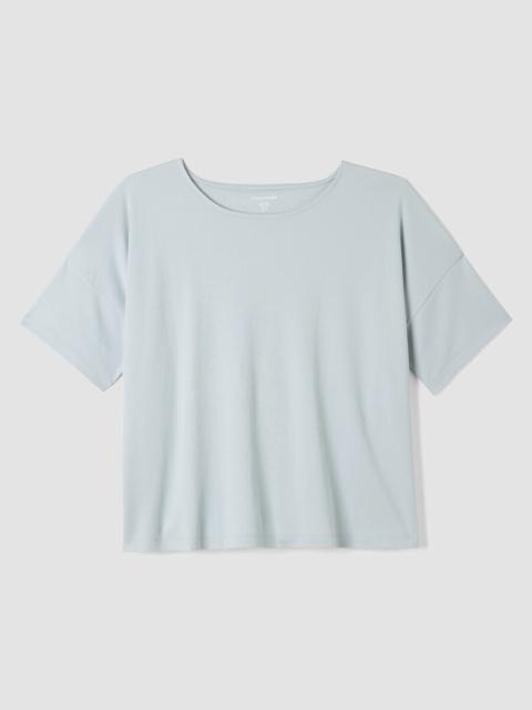 A jewel neck tee perfect for sleep or just lounging around. Designed with versatility in mind—pair with one of our matching bottoms or mix and match. Soft and drapey in organic Pima cotton that's grown using regenerative farming practices. Style No. SLANK-T930 DESIGN - Designed with a generous, boxy fit that drapes away from the body to create movement. - Only available online. - Flaviana is 5'9" and wears a size S, which measures 24 inches on the body. - Jewel neck, drop shoulder, 2-inch side slits. - Finished with banding at the neck. - Style No. SLANK-T930 FABRIC - Organic Pima cotton, doubleknit with interlocking stitches for body and structure. Now grown using regenerative farming methods that focus on soil health and biodiversity. - Machine wash cold. Tumble dry low. - Made in Peru. 100% Organic Cotton. SUSTAINABILITY - Organic farming supports clean water and healthy soil.