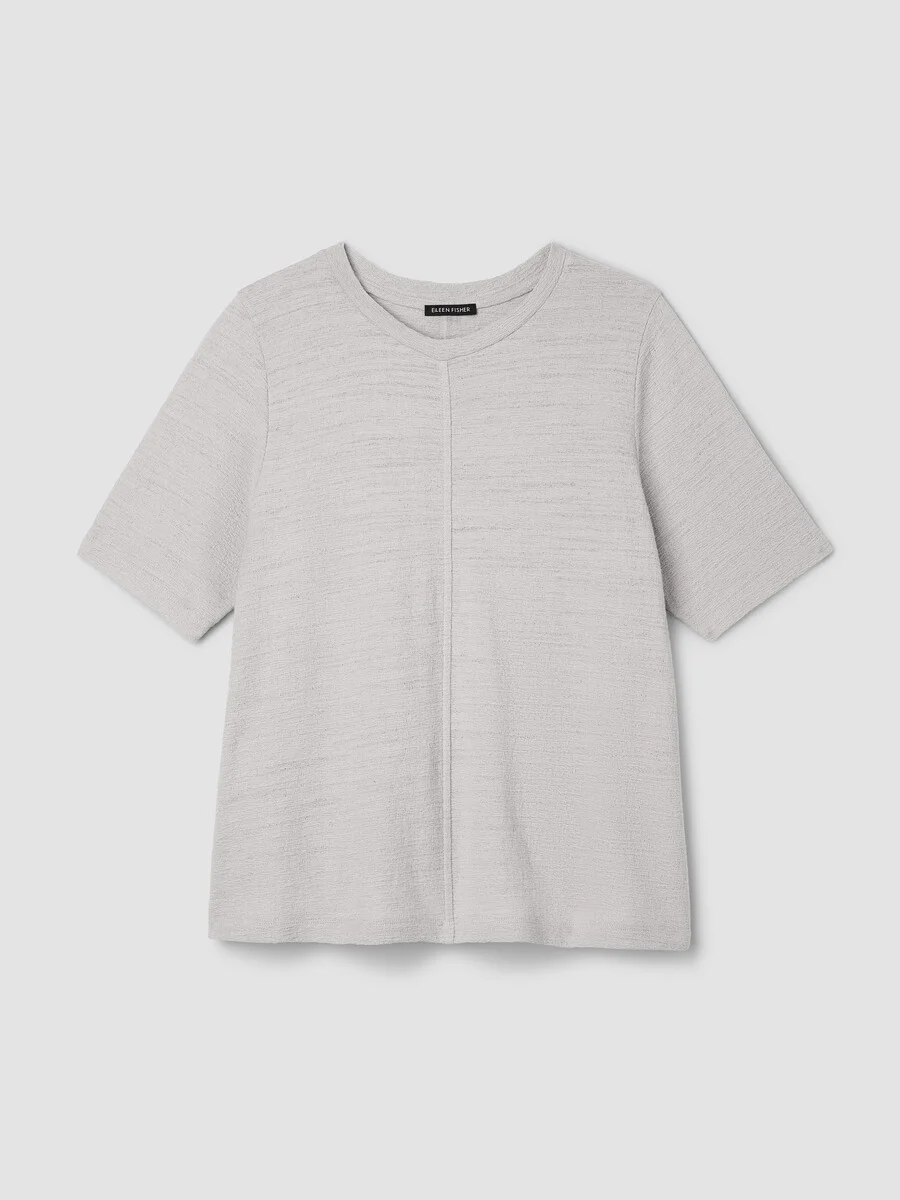 An elevated crew neck tee with a sweater-soft feel. In a textural jacquard made with organic cotton. Style No. S6KQO-T6304 DESIGN - Close at the shoulders, wider at the hem. A silhouette that fits the body with ease. - Size S measures 24 inches on the body. Size 1X measures 26 1/2 inches on the body. - Crew neck, short sleeves. - Center front and back seams. - Finished with banding at the neck. - Style No. S6KQO-T6304 FABRIC - Sweater soft. A dimensional jacquard, in organic cotton that's double knit for structure. - Machine wash cold. Tumble dry low. - Made in Indonesia. 100% Organic Cotton. SUSTAINABILITY - Organic farming supports clean water and healthy soil.