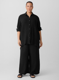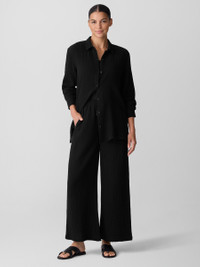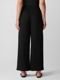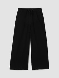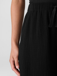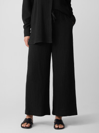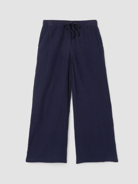 The wide-leg pant, transformed by breezy texture. Designed with a drawstring waist and pockets, in our light Organic Cotton Gauze. Made in a Fair Trade Certified™ factory. Style No. S5GBA-P4869 DESIGN - Slim through the hips, wider through the leg. Fits the body with ease. - White pant only available online and in our LAB store. - Kalyane is 5'10" and wears a size S. Haejin is 5'5" and wears a size PS. - 1 1/2-inch elastic waistband with drawstring. - On-seam pockets. - 11-inch rise; 27-inch inseam; 13-inch leg opening (size S). 11-inch rise; 25 2-inch inseam; 12 1/2-inch leg opening (size PS). 13-inch rise; 27-inch inseam; 14-inch leg opening (size 1X). - Please note White pant does not have pockets. - Style No. S5GBA-P4869 FABRIC - Woven with pockets of air. Two layers of gauzy organic cotton that create rippled texture. - Hand wash cold. Line dry. Do not dry clean. May snag on jewelry. - Made in Indonesia. 100% Organic Cotton. SUSTAINABILITY - Our Fair Trade Certified™ factories meet rigorous social and environmental standards. By choosing Fair Trade Certified™ products, you’re helping to improve the lives of workers, build resilient communities and protect the environment. - Organic farming supports clean water and healthy soil. - This fabric is bluesign® APPROVED. It's dyed with safer chemistry using less water and less energy, meeting the bluesign® CRITERIA.