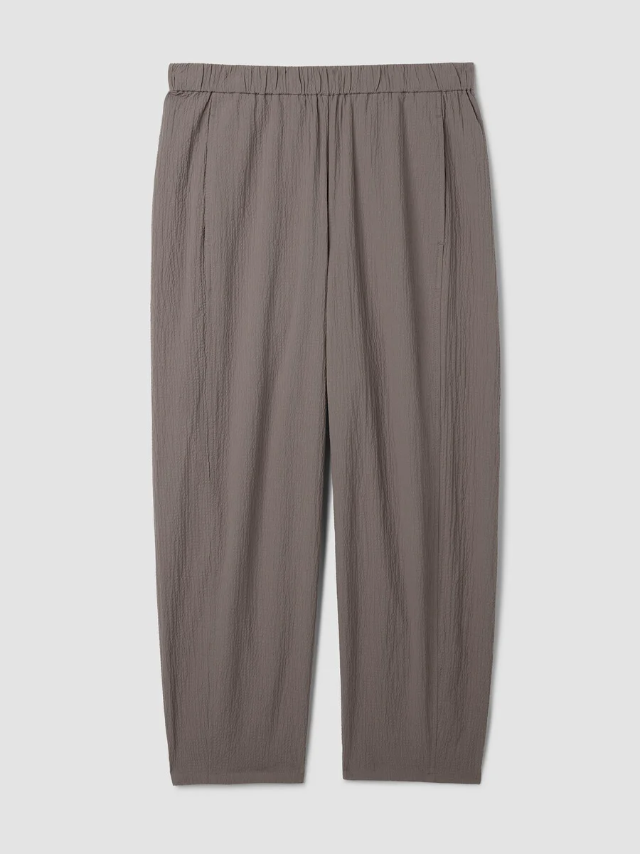 The lantern pant. A best-selling shape set apart by puckery texture. In light and breezy organic cotton that's washed for a subtly crinkled finish. Style No. S6JRD-P4366 DESIGN - Subtly curved through the leg, slightly tapered at the ankle. Fits the body with ease. - Kalyane is 5'10" and wears a size S in Walnut. Christina is 5'10" and wears a size 1X in Walnut. - 1 1/2-inch elastic waistband. - Side panel detail, on-seam pockets. - 11-inch rise; 27-inch inseam; 7-inch leg opening (size XS). 11-inch rise; 25-inch inseam; 7-inch leg opening (size PS). 13-inch rise; 27-inch inseam; 8 1/2-inch leg opening (size 1X). - Style No. S6JRD-P4366 FABRIC - A lightweight weave with the look of seersucker and the softness of organic cotton. Washed for crinkled texture. - Machine wash cold. Line dry. - Made in Indonesia. 99% Org Cotton/1% Elastane. SUSTAINABILITY - Organic farming supports clean water and healthy soil.