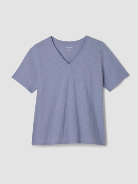 The V-neck tee—a simple staple you'll reach for again and again. In a soft and slubby jersey that's made with regeneratively grown organic cotton fiber. Style No. S6SJP-T6070 DESIGN - Close at the shoulders, wider at the hem. A silhouette that fits the body withease. - Only available at select EILEEN FISHER stores. - Astrid is 5'9" and wears a size S in Aquarius, which measures 24 1/2 inches onthe body. Ryan is 5'8" and wears a size 1X, which measures 27 1/2 inches on thebody. - V-neck, short sleeves. - Finished with banding at the neck. - Style No. S6SJP-T6070 FABRIC - Soft and light, an organic cotton jersey with the visual texture that comes froma very fine slub yarn. We use fiber that's grown using regenerative farmingmethods that support soil health and biodiversity. Grown, spun, dyed and knit inPeru. - Machine wash cold. Tumble dry low. - Made in Peru. 100% Organic Cotton. SUSTAINABILITY - Organic farming supports clean water and healthy soil.
