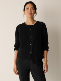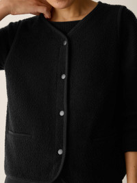 The vest. A layering essential transformed by the nubbly texture of our soft boucle knit. Style No. S6NBO-V1359 DESIGN - Designed with a generous, boxy fit that drapes away from the body to create movement. - Kalyane is 5'10" and wears a size S, which measures 22 1/2 inches on the body. Size 1X measures 24 1/2 inches on the body. - V-neck, snap button front, sleeveless. - Welt pockets. - Style No. S6NBO-V1359 FABRIC - A nubbly boucle knit made from soft organic cotton. For pieces with structure, and a touch of stretch. - Machine wash cold. Reshape and lay flat to dry. - Made in Vietnam. 97% Organic Cotton/3% Spandex. SUSTAINABILITY - Organic farming supports clean water and healthy soil.