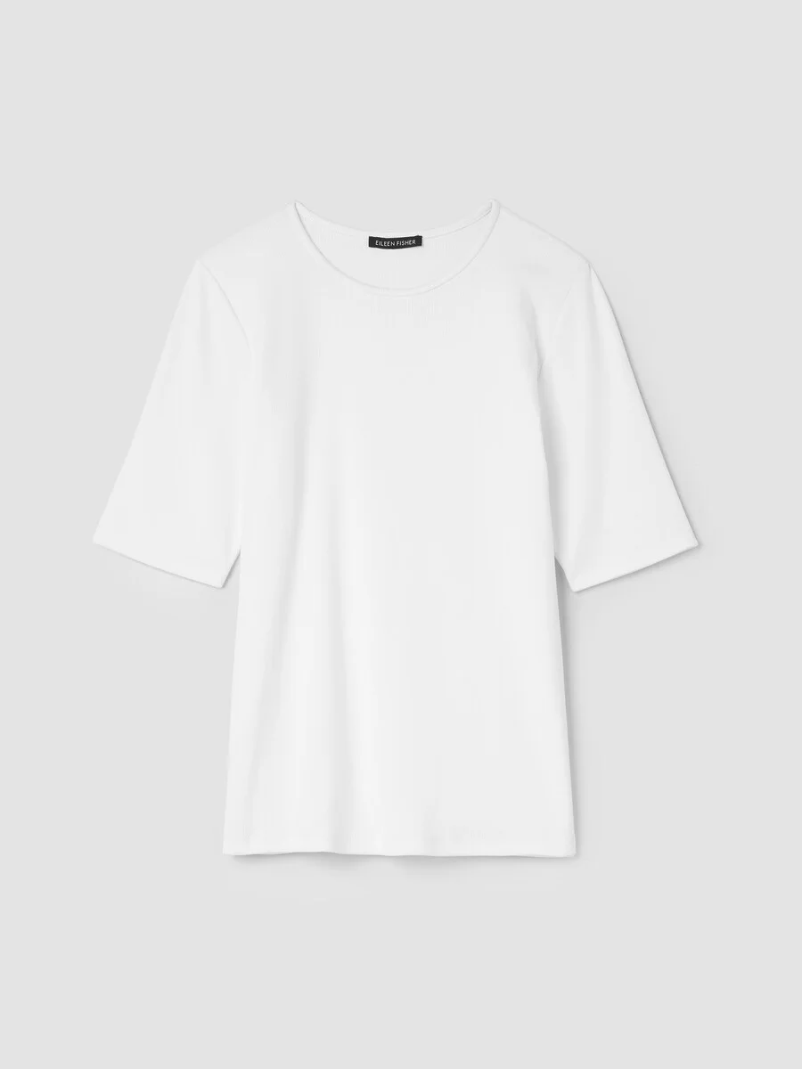 Simple and effortless. The crew neck tee with elbow sleeves, in organic cotton with subtly ribbed texture. Style No. F5XJU-T6189 DESIGN - Fits close to the body. Our slim fit is easier than the industry standard—withstretch for maximum comfort. - Jisu is 5'9" and wears a size XS, which measures 24 inches on the body. - Crew neck, elbow sleeves. - Style No. F5XJU-T6189 FABRIC - A fine, two-by-two rib with softness and stretch. For basics withsophistication. We use fiber that's grown using regenerative farming methodsthat support soil health and biodiversity. - Machine wash cold. Tumble dry low. - Made in Peru. 100% Organic Cotton. SUSTAINABILITY - Organic farming supports clean water and healthy soil.