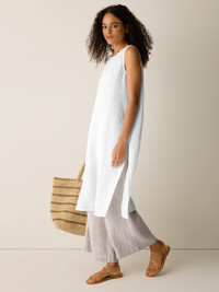 A breezy top with a long silhouette and dramatic side slits for movement, in airy organic linen. Style No. S6OLA-U4420 DESIGN - Close at the shoulders, wider at the hem. A silhouette that fits the body with ease. - White top only available online and in our LAB stores. - Sarah is 5'7" and wears a size XS in White, which measures 43 inches on the body. Nina is 5'3" and wears a size PS in Black, which measures 40 inches on the body. Christina is 5'10" and wears a size 1X in White, which measures 44 1/2 inches on the body. - Round neck, sleeveless, 22-inch side slits. - Keyhole back closure with river shell button. - Style No. S6OLA-U4420 FABRIC - Our lightest, finest organic linen. Flax from France in a handkerchief-weight weave. Loved since 1997. - Machine wash cold. Line dry. Do not steam. - Made in Indonesia. 100% Organic Linen. SUSTAINABILITY - Organic farming supports clean water and healthy soil.