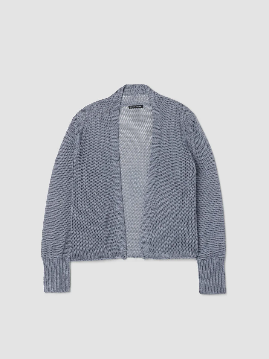 The cropped cardigan. A light layer with ribbed cuffs, in a blend of airy linen and soft cotton. Style No. S6GBI-K5436 DESIGN - Close at the shoulders, wider at the hem. A silhouette that fits the body with ease. - Kalyane is 5'10" and wears a size S in Black, which measures 22 inches on the body. Size 1X measures 24 1/2 inches on the body. - High collar, open front. - Ribbed cuffs. - Style No. S6GBI-K5436 FABRIC - When textural organic linen is knit with soft organic cotton, something special happens. A yarn with body, movement and versatility. Dress it up—or dress it down. - Hand wash cold. Reshape and lay flat to dry. May snag in jewelry. - Made in Cambodia. 68% Organic Linen/32% Organic Cotton. SUSTAINABILITY - Organic farming supports clean water and healthy soil.