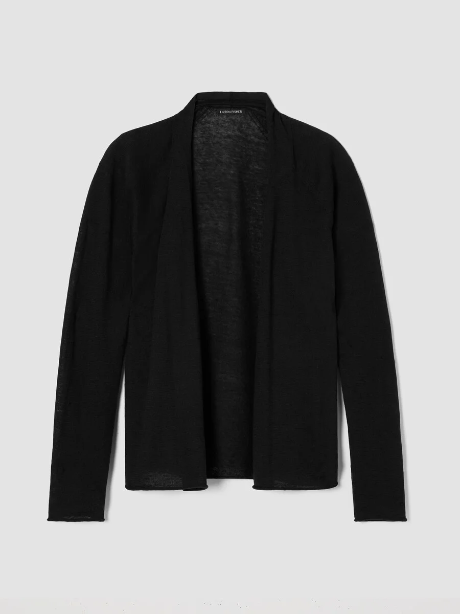 The high collar cardigan. An effortless layer with an open front and raglan sleeves. In a textural blend of organic linen and organic cotton. Style No. S5PNJ-K5437 DESIGN - Designed with a generous, boxy fit that drapes away from the body to create movement. - Only available online. - Monika is 5'9" and wears a size XS, which measures 24 1/2 inches on the body. Size 1X measures 27 1/2 inches on the body. - High collar, raglan seams, open front. - Style No. S5PNJ-K5437 FABRIC - When textural organic linen is knit with soft organic cotton, something special happens. A yarn with body, movement and versatility. Dress it up—or dress it down. - Hand wash cold. Reshape and lay flat to dry. May snag on jewelry. - Made in Hong Kong. 68% Organic Linen/32% Organic Cotton. SUSTAINABILITY - Organic farming supports clean water and healthy soil.