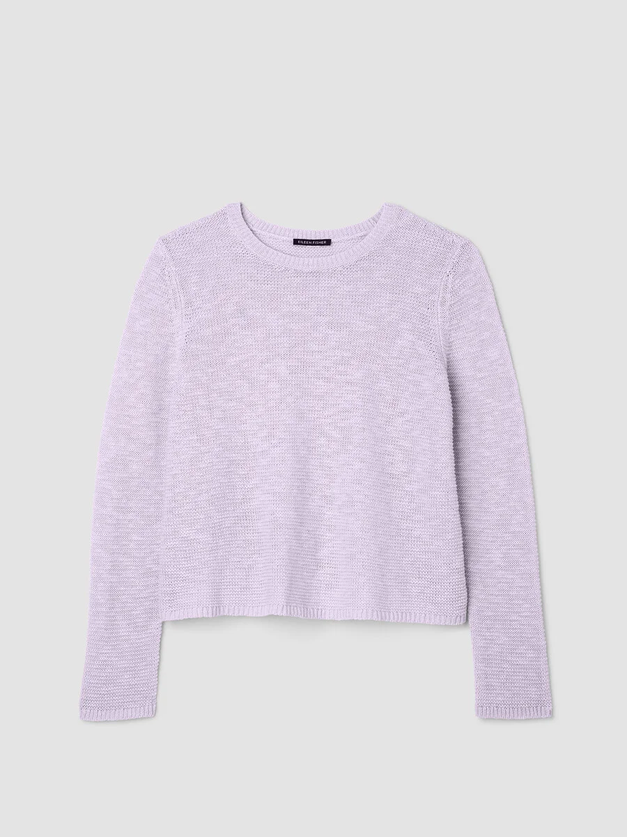 A classic shape set apart by soft, subtle texture. The crew neck top, in fine organic cotton now grown using regenerative farming methods. Style No. S6LEL-W5971 DESIGN - Close at the shoulders, wider at the hem. A silhouette that fits the body with ease. - Ravyanshi is 5'8" and wears a size S in Lilac Frost, which measures 22 1/2 inches on the body. Size 1X measures 25 inches on the body. - Crew neck. - Finished with ribbed trim at the neck. - Style No. S6LEL-W5971 FABRIC - A textural knit that transforms simple shapes. In a slubby blend of organic cotton and organic linen that feels cool and light. - Machine wash cold. Reshape and lay flat to dry. May snag on jewelry. - May snag on jewelry. Wear with care. - Made in Vietnam. 56% Organic Linen/44% Organic Cotton. SUSTAINABILITY - Organic farming supports clean water and healthy soil.