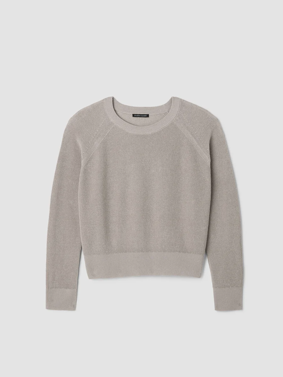 The wedge sweater. A simple silhouette that tapers slightly at the waist, in a textural knit made from organic linen and cotton. Style No. S6FWA-W6277 DESIGN - A generous, boxy fit that drapes away from the body to create movement. - Black sweater only available online and in our LAB stores. - Ravyanshi is 5'8" and wears a size XS in Breeze, which measures 22 inches on the body. Christina is 5'10" and wears a size 1X in Undyed Natural, which measures 24 1/2 inches on the body. - Crew neck, raglan seams. - Finished with ribbed trim at the cuffs and hem. - Style No. S6FWA-W6277 FABRIC - When textural organic linen is knit with soft organic cotton, something special happens. A yarn with body, movement and versatility. Dress it up—or dress it down. - Hand wash cold. Reshape and lay flat to dry. May snag on jewelry. - Made in Vietnam. 68% Organic Linen/32% Organic Cotton. SUSTAINABILITY - Organic farming supports clean water and healthy soil.