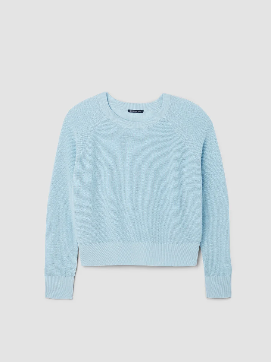 The wedge sweater. A simple silhouette that tapers slightly at the waist, in a textural knit made from organic linen and cotton. Style No. S6FWA-W6277 DESIGN - A generous, boxy fit that drapes away from the body to create movement. - Black sweater only available online and in our LAB stores. - Ravyanshi is 5'8" and wears a size XS in Breeze, which measures 22 inches on the body. Christina is 5'10" and wears a size 1X in Undyed Natural, which measures 24 1/2 inches on the body. - Crew neck, raglan seams. - Finished with ribbed trim at the cuffs and hem. - Style No. S6FWA-W6277 FABRIC - When textural organic linen is knit with soft organic cotton, something special happens. A yarn with body, movement and versatility. Dress it up—or dress it down. - Hand wash cold. Reshape and lay flat to dry. May snag on jewelry. - Made in Vietnam. 68% Organic Linen/32% Organic Cotton. SUSTAINABILITY - Organic farming supports clean water and healthy soil.