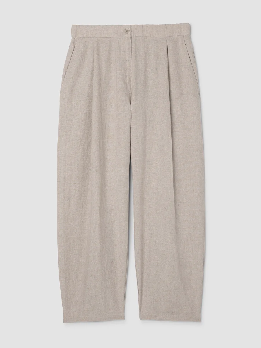 Front pleats and a distinctly curved silhouette elevate a relaxed trouser. Cool and crisp in our signature Organic Linen. Style No. S6RII-P4912 DESIGN - Curved through the leg, slightly tapered at the ankle. Fits the body with ease. - Only available at select EILEEN FISHER stores. - Sarah is 5'7" and wears a size XS in Black. Christina is 5'10" and wears a size 1X in Undyed Natural. - 1-inch elastic waistband, zipper fly front with corozo button closure. - Front pleats, slash pockets. - 12-inch rise; 27-inch inseam; 9-inch leg opening (size S). 14-inch rise; 27-inch inseam; 10-inch leg opening (size 1X). - Style No. S6RII-P4912 FABRIC - Our medium-weight organic linen—natural texture with a relaxed feel. Loved since 2008. - Machine wash cold. Line dry. Do not dry clean. - Made in Vietnam. 100% Organic Linen. SUSTAINABILITY - Organic farming supports clean water and healthy soil. - This fabric is bluesign® APPROVED. It's dyed with safer chemistry using less water and less energy, meeting the bluesign® CRITERIA.