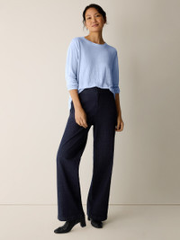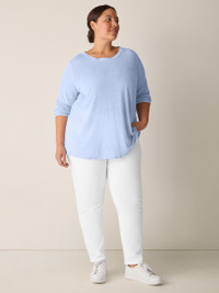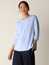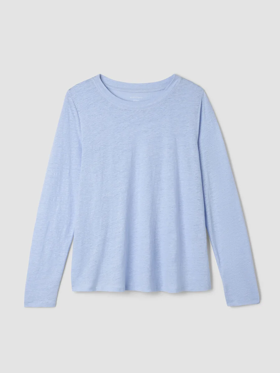 An elevated basic with a crew neck and long sleeves. In our signature Organic Linen Jersey, lightweight with subtle texture. Made in a Fair Trade Certified™ factory. Style No. S6IZ1-T5670 DESIGN - Close at the shoulders, wider at the hem. A silhouette that fits the body with ease. - Astrid is 5'9" and wears a size S in River, which measures 24 1/2 inches on the body. Haejin is 5'5" and wears a size PS, which measures 24 inches on the body. Ryan is 5'8" and wears a size 1X, which measures 27 1/2 inches on the body. - Crew neck, long sleeves. - Finished with banding at the neck. - Style No. S6IZ1-T5670 FABRIC - The natural texture of linen in a breezy knit that's casual yet sophisticated. - Machine wash cold. Tumble dry low. - Made in Vietnam. 100% Organic Linen. SUSTAINABILITY - Our Fair Trade Certified™ factories meet rigorous social and environmental standards. By choosing Fair Trade Certified™ products, you’re helping to improve the lives of workers, build resilient communities and protect the environment. - Organic farming supports clean water and healthy soil. - This fabric is bluesign® APPROVED. It's dyed with safer chemistry using less water and less energy, meeting the bluesign® CRITERIA.