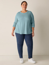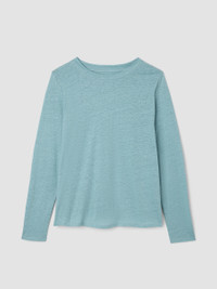 An elevated basic with a crew neck and long sleeves. In our signature Organic Linen Jersey, lightweight with subtle texture. Made in a Fair Trade Certified™ factory. Style No. S6IZ1-T5670 DESIGN - Close at the shoulders, wider at the hem. A silhouette that fits the body with ease. - Astrid is 5'9" and wears a size S in River, which measures 24 1/2 inches on the body. Haejin is 5'5" and wears a size PS, which measures 24 inches on the body. Ryan is 5'8" and wears a size 1X, which measures 27 1/2 inches on the body. - Crew neck, long sleeves. - Finished with banding at the neck. - Style No. S6IZ1-T5670 FABRIC - The natural texture of linen in a breezy knit that's casual yet sophisticated. - Machine wash cold. Tumble dry low. - Made in Vietnam. 100% Organic Linen. SUSTAINABILITY - Our Fair Trade Certified™ factories meet rigorous social and environmental standards. By choosing Fair Trade Certified™ products, you’re helping to improve the lives of workers, build resilient communities and protect the environment. - Organic farming supports clean water and healthy soil. - This fabric is bluesign® APPROVED. It's dyed with safer chemistry using less water and less energy, meeting the bluesign® CRITERIA.
