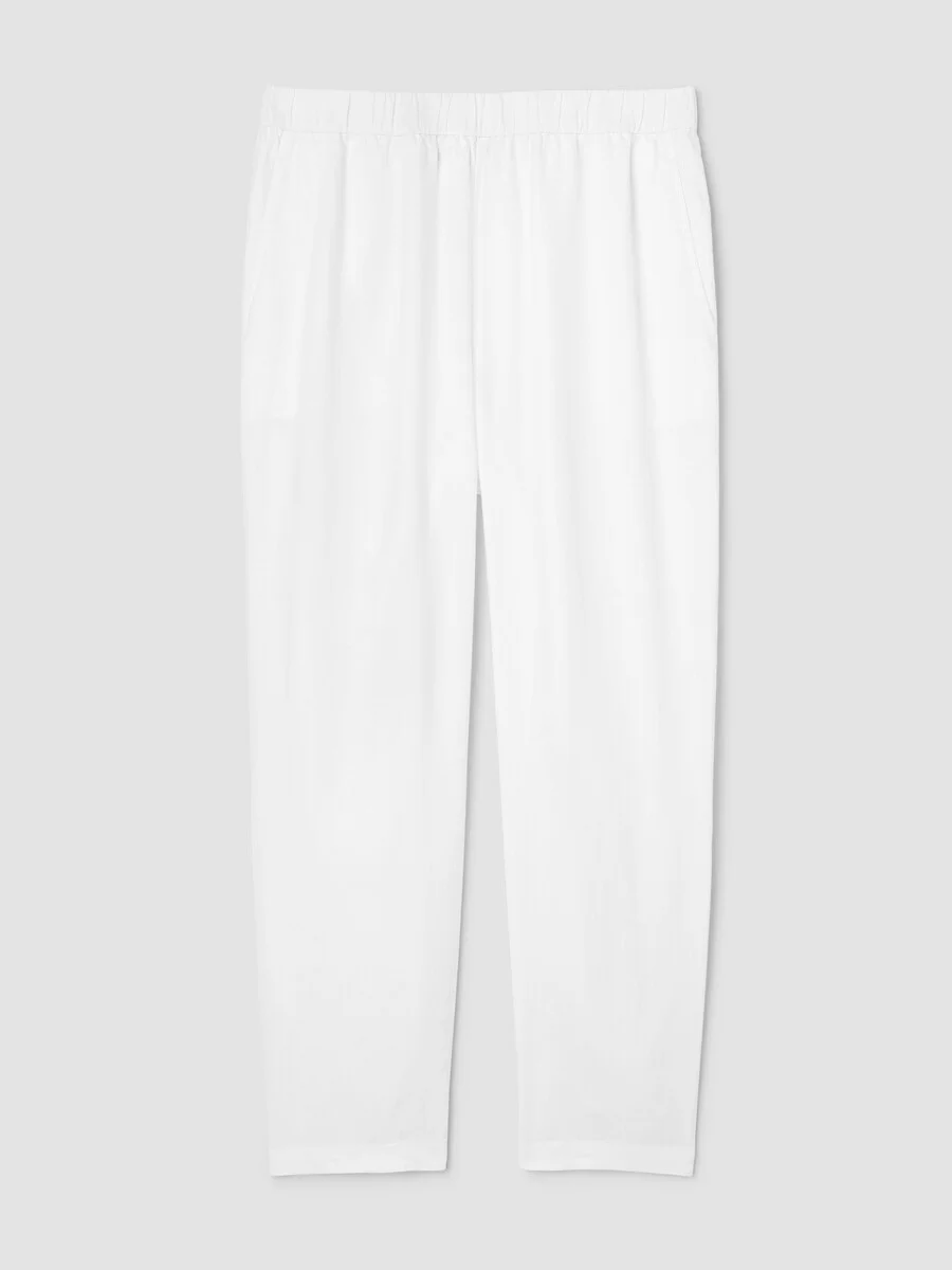 The tapered pant. A wardrobe essential in our crisp Organic Linen. Style No. S6RII-P4700 DESIGN - A silhouette designed to taper at the ankle. Fits the body with ease. - Bo Bay is 5'9" and wears a size S in White. Nina is 5'3" and wears a size PS in Undyed Natural. Christina is 5'10" and wears a size 1X in White. - 1 1/2-inch elastic waistband, front slash pockets. - Back darts for shape. - 11 1/2-inch rise; 27 1/2-inch inseam; 7-inch leg opening (size S). 11-inch rise; 25 1/2-inch inseam; 6 1/2-inch leg opening (size PS). 13 1/2-inch rise; 27 1/2-inch inseam; 8-inch leg opening (size 1X). - Style No. S6RII-P4700 FABRIC - Our medium-weight organic linen—natural texture with a relaxed feel. Loved since 2008. - Machine wash cold. Line dry. Do not dry clean. - Made in Vietnam. 100% Organic Linen. SUSTAINABILITY - Organic farming supports clean water and healthy soil. - This fabric is bluesign® APPROVED. It's dyed with safer chemistry using less water and less energy, meeting the bluesign® CRITERIA.