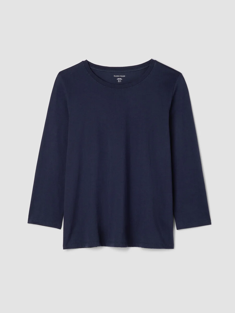 The round neck tee. An elevated basic, now with 3/4 sleeves. Made from soft organic Pima cotton that's grown using regenerative farming methods. Style No. S6KRS-T6387 DESIGN - Close at the shoulders, wider at the hem. For an even easier fit, size up. - Black tee only available online. - Drew is 5'9" and wears a size XS in White, which measures 25 inches on the body. Ryan is 5'8" and wears a size 1X, which measures 27 1/2 inches on the body. - Round neck, 3/4 sleeves. - Finished with banding at the neck. - Style No. S6KRS-T6387 FABRIC - A jersey knit with the smoothness and luster that come from a luxurious fiber—extra-long staple organic cotton that's grown using regenerative farming methods. Grown, spun, dyed and knit in Peru. - Machine wash cold. Lay flat to dry. Do not dry clean. - Made in Peru. 100% Organic Cotton. SUSTAINABILITY - Organic farming supports clean water and healthy soil.