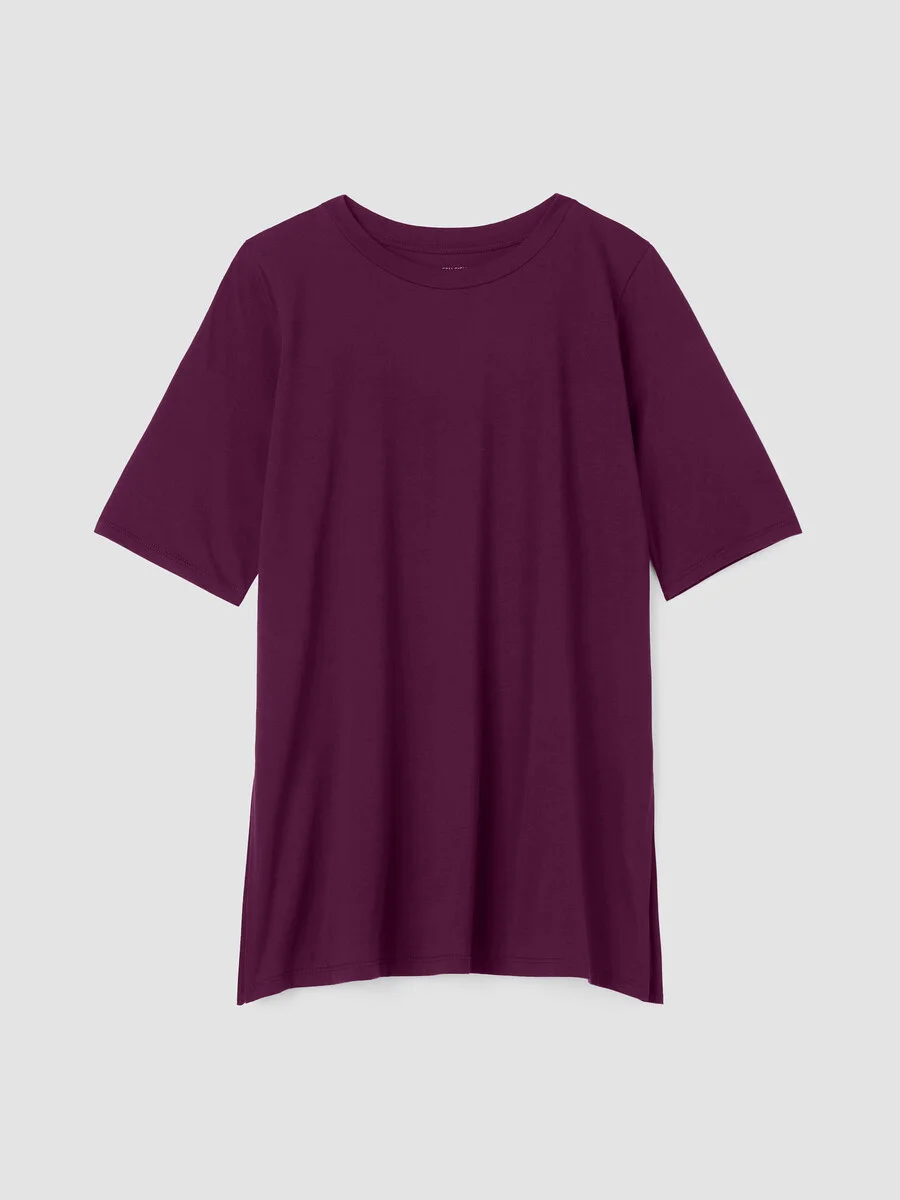 A new take on a wardrobe essential. The crew neck T-shirt updated with elbow sleeves and dramatic side slits for movement. In Organic Pima Cotton Jersey that's now grown using regenerative farming methods. Style No. S5KRS-T6171 DESIGN - Close at the shoulders, wider at the hem. A silhouette that fits the body with ease. - Size XS measures 29 inches on the body. Size 1X measures 32 inches on the body. - Crew neck, elbow sleeves. - 9-inch side slits. - Finished with banding at the neck. - Style No. S5KRS-T6171 FABRIC - A jersey knit with the smoothness and luster that come from a luxurious fiber—extra-long staple organic cotton. Now grown using regenerative farming methods that focus on soil health and biodiversity. Grown, spun, dyed and knit in Peru. - Machine wash cold. Lay flat to dry. Do not dry clean. - Made in Peru. 100% Organic Cotton. SUSTAINABILITY - Organic farming supports clean water and healthy soil.