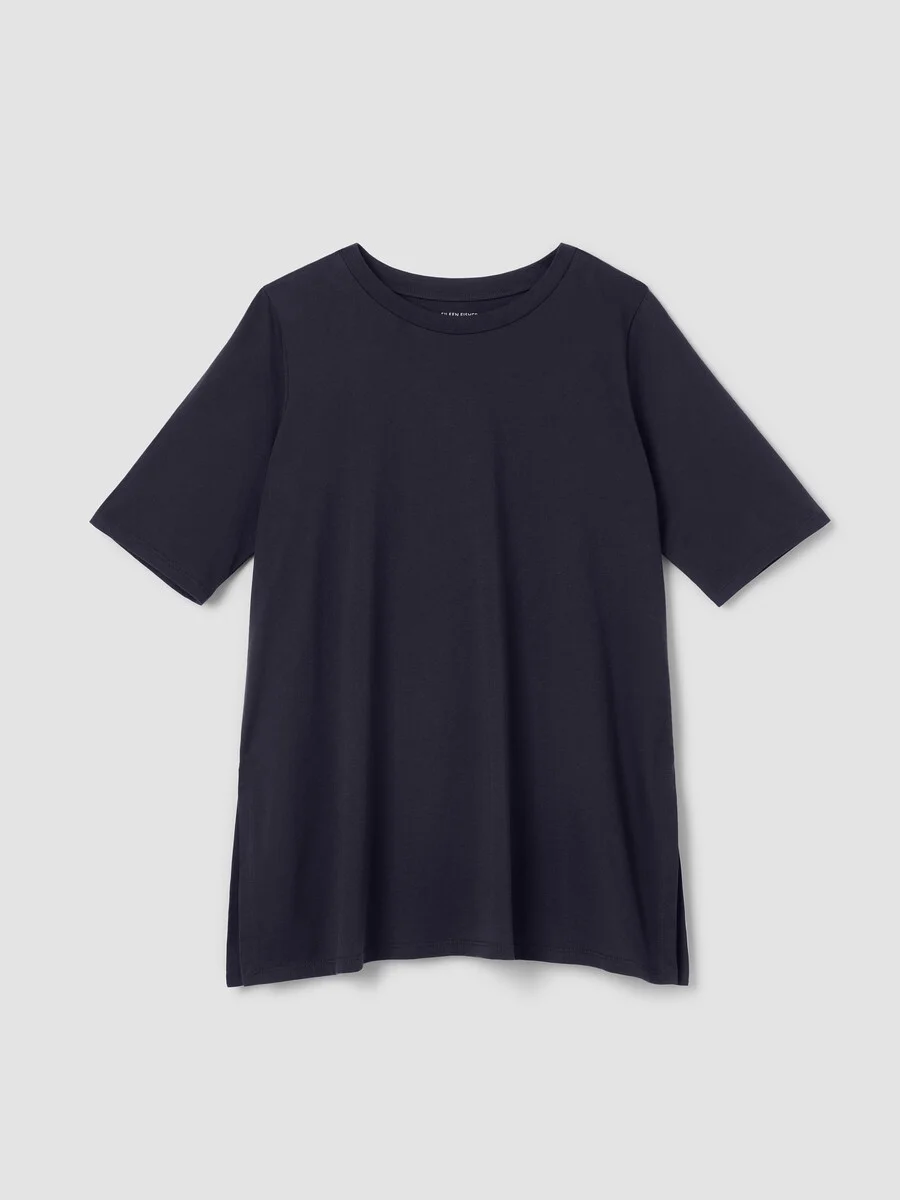 A new take on a wardrobe essential. The crew neck T-shirt updated with elbow sleeves and dramatic side slits for movement. In Organic Pima Cotton Jersey that's now grown using regenerative farming methods. Style No. S5KRS-T6171 DESIGN - Close at the shoulders, wider at the hem. A silhouette that fits the body with ease. - Size XS measures 29 inches on the body. Size 1X measures 32 inches on the body. - Crew neck, elbow sleeves. - 9-inch side slits. - Finished with banding at the neck. - Style No. S5KRS-T6171 FABRIC - A jersey knit with the smoothness and luster that come from a luxurious fiber—extra-long staple organic cotton. Now grown using regenerative farming methods that focus on soil health and biodiversity. Grown, spun, dyed and knit in Peru. - Machine wash cold. Lay flat to dry. Do not dry clean. - Made in Peru. 100% Organic Cotton. SUSTAINABILITY - Organic farming supports clean water and healthy soil.