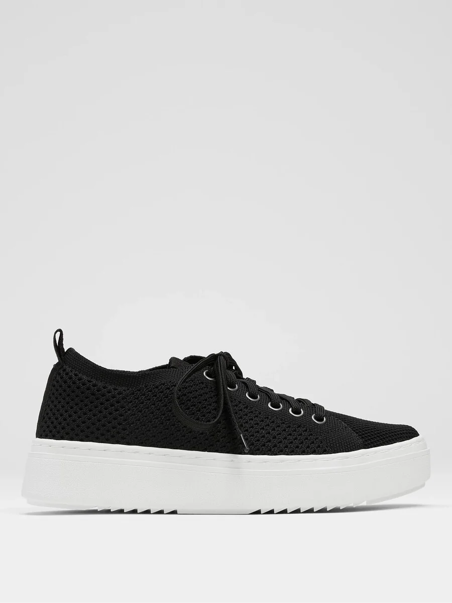A classic sneaker for every day. With a comfortable wedge heel and lace-up styling. In a sustainable stretch knit made from recycled plastic bottles. Style No. EF48248 DESIGN - Rubber outsole with tread bottom for comfort, flexibility and traction. - Only available online and at select EILEEN FISHER stores. - 1 1/2-inch heel with 1 1/2-inch platform. - Almond toe, wedge heel. - Lace-up construction; pull tab detail. - Padded toe, arch and heel for comfort; recycled mesh lining. - Style No. EF48248 FABRIC - Stretch knit upper made using recycled polyester created from 100% post-consumer plastic bottles. Meets the Global Recycled Standard. - Lace-up construction; pull tab detail. Padded toe, arch and heel for comfort; recycled mesh lining. - Made in China. SUSTAINABILITY - Recycled mesh lining made from 50% post-consumer plastic bottles. Insoles made using sustainable BLOOM foam, an algae-based alternative to synthetic flexible foams. BLOOM foam helps sequester carbon and filter polluted water.
