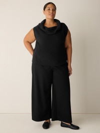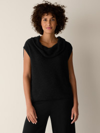 A piece that redefines cozy. An elevated vest you can wear multiple ways, in a fluffy blend of organic cotton and recycled nylon. Made in a Fair Trade Certified™ factory. Style No. S6VPD-V1360 DESIGN - A generous, boxy fit that drapes away from the body to create movement. - Only available at select EILEEN FISHER stores. - Astrid is 5'9" and wears a size S in Black, which measures 22 inches on the body. Size 1X measures 24 1/2 inches on the body. - Drape neck, cap sleeves. - Style No. S6VPD-V1360 FABRIC - Soft and fluffy, a cozy blend of organic cotton and recycled nylon spun to create a two-tone yarn. - Hand wash cold. Reshape and lay flat to dry. May snag on jewelry. - Made in Peru. 83% Organic Cotton/17% Recycled Nylon. SUSTAINABILITY - Our Fair Trade Certified™ factories meet rigorous social and environmental standards. By choosing Fair Trade Certified™ products, you’re helping to improve the lives of workers, build resilient communities and protect the environment. - Local cotton that's knit in Fair Trade Certified™ factories in Arequipa, Peru. - Organic farming supports clean water and healthy soil.