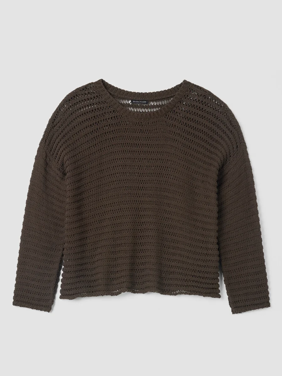 The crew neck top—a light layer transformed by dimensional texture. Made from soft organic cotton that's grown using regenerative farming methods. Style No. S5AYT-W6217 DESIGN - A generous, boxy fit that drapes away from the body to create movement. - Monika is 5'9" and wears a size XS, which measures 23 inches on the body. Size1X measures 26 inches on the body. - Crew neck, drop shoulder. - Ribbed trim at the neck. - Style No. S5AYT-W6217 FABRIC - The organic cotton that first brought us to Peru, now with visual texture thanksto a twisted cord yarn. Now grown using regenerative farming methods thatsupport soil health and biodiversity. Grown, spun, dyed and knit in Peru. - Hand wash cold. Reshape and lay flat to dry. May snag on jewelry. - Made in Peru. 100% Organic Cotton. SUSTAINABILITY - Organic farming supports clean water and healthy soil.