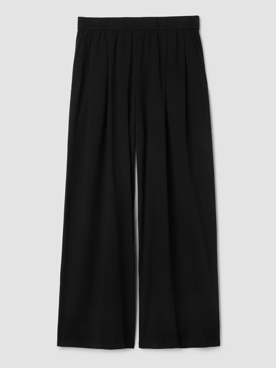 Deep pleats and an exaggerated wide leg elevate a modern silhouette. In organic Pima cotton that's grown using regenerative farming practices. Style No. S6OJH-P4886 DESIGN - Slim through the hips, wider through the leg. Fits the body with ease. - Kalyane is 5'10" and wears a size S in Black. Christina is 5'10" and wears a size 1X in Black. - 1 1/2-inch elastic waistband. - Front pleats, slash pockets. - Back darts for shape. - 12-inch rise; 29 1/2-inch inseam; 13 1/2-inch leg opening (size S). 14-inch rise; 29 1/2-inch inseam; 14 1/2-inch leg opening (size 1X). - Style No. S6OJH-P4886 FABRIC - Soft and stretchy. A jersey knit with the luxurious feel that comes from extra-long staple organic cotton. We use fiber that's grown using regenerative farming methods that focus on soil health and biodiversity. - Machine wash cold. Tumble dry low. - Made in Peru. 93% Organic Cotton/7% Spandex. SUSTAINABILITY - Organic farming supports clean water and healthy soil.