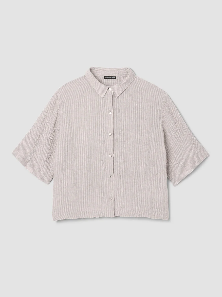 Our quintessential warm-weather shirt with a classic collar and elbow sleeves, in a striped version of our Puckered Organic Linen. Style No. S6YCN-T6450 DESIGN - Close at the shoulders, wider at the hem. A silhouette that fits the body with ease. - Only available at select EILEEN FISHER stores. - Kalyane is 5'10" and wears a size S in Wheat, which measures 22 inches on the body. Christina is 5'10" and wears a size 1X in Wheat, which measures 24 1/2 inches on the body. - Classic collar, button front, elbow sleeves. - Inverted back box pleat. - River shell buttons. - Style No. S6YCN-T6450 FABRIC - A yarn-dyed stripe with the look of seersucker and the lightness and breathability of organic linen. Washed for crinkled texture. - Made in Indonesia. SUSTAINABILITY - Organic farming supports clean water and healthy soil.