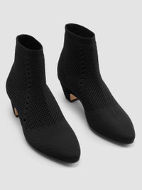 A sophisticated bootie that hugs the ankle, thanks to a textured stretch knit made from recycled plastic bottles. With a sculpted heel and tapered toe. Style No. EF46223 DESIGN - Suede-covered heel; leather outsole with rubber microinjected pod for comfort,flexibility and traction. - Only available at select EILEEN FISHER stores. - 1 1/2-inch heel. 4 1/2-inch shaft height. - Almond toe, cone-shaped heel. - Pull-on construction. - Padded toe, arch and heel for comfort; leather lining. - Style No. EF46223 FABRIC - Stretch knit upper made using recycled polyester created from 100% postconsumerplastic bottles. Meets the Global Recycled Standard. - Comes with a drawstring dust bag. - Made in China. SUSTAINABILITY - Suede and leather lining are finished at an LWG Gold-Rated Tannery.