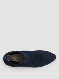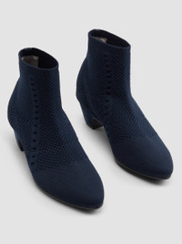 A sophisticated bootie that hugs the ankle, thanks to a textured stretch knit made from recycled plastic bottles. With a sculpted heel and tapered toe. Style No. EF46223 DESIGN - Suede-covered heel; leather outsole with rubber microinjected pod for comfort,flexibility and traction. - Only available at select EILEEN FISHER stores. - 1 1/2-inch heel. 4 1/2-inch shaft height. - Almond toe, cone-shaped heel. - Pull-on construction. - Padded toe, arch and heel for comfort; leather lining. - Style No. EF46223 FABRIC - Stretch knit upper made using recycled polyester created from 100% postconsumerplastic bottles. Meets the Global Recycled Standard. - Comes with a drawstring dust bag. - Made in China. SUSTAINABILITY - Suede and leather lining are finished at an LWG Gold-Rated Tannery.