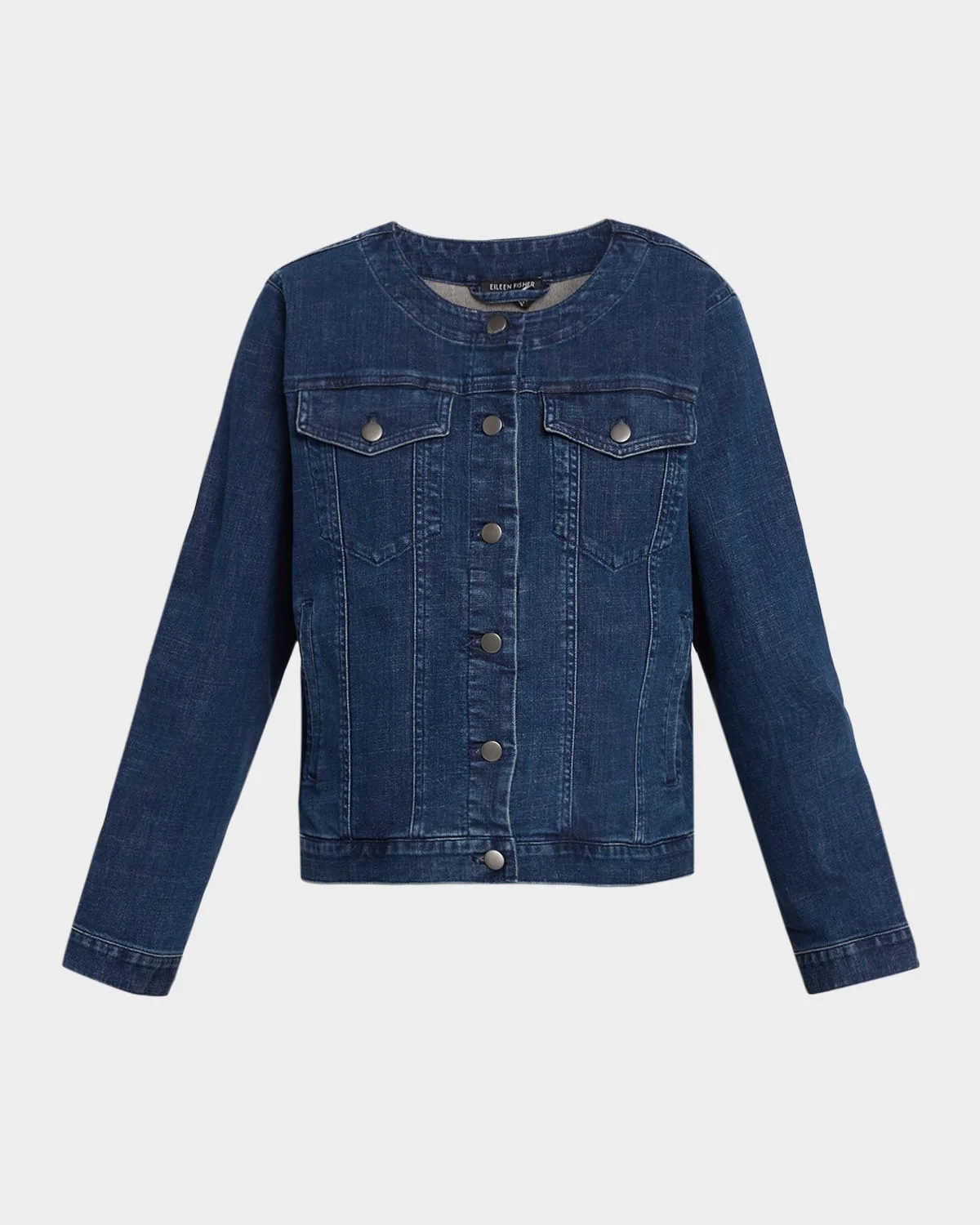 This Eileen Fisher jacket is crafted in an organic cotton-blend denim finished with a dark wash and vertical seams Scoop neckline; button-down front Long sleeves; button cuffs Buttoned chest flap pockets Side welt pockets Relaxed fit Organic cotton/elastane Machine wash cold Imported SIZE & FITModel measurements: 5 & apos;10" tallModel is wearing a US size 4/Small