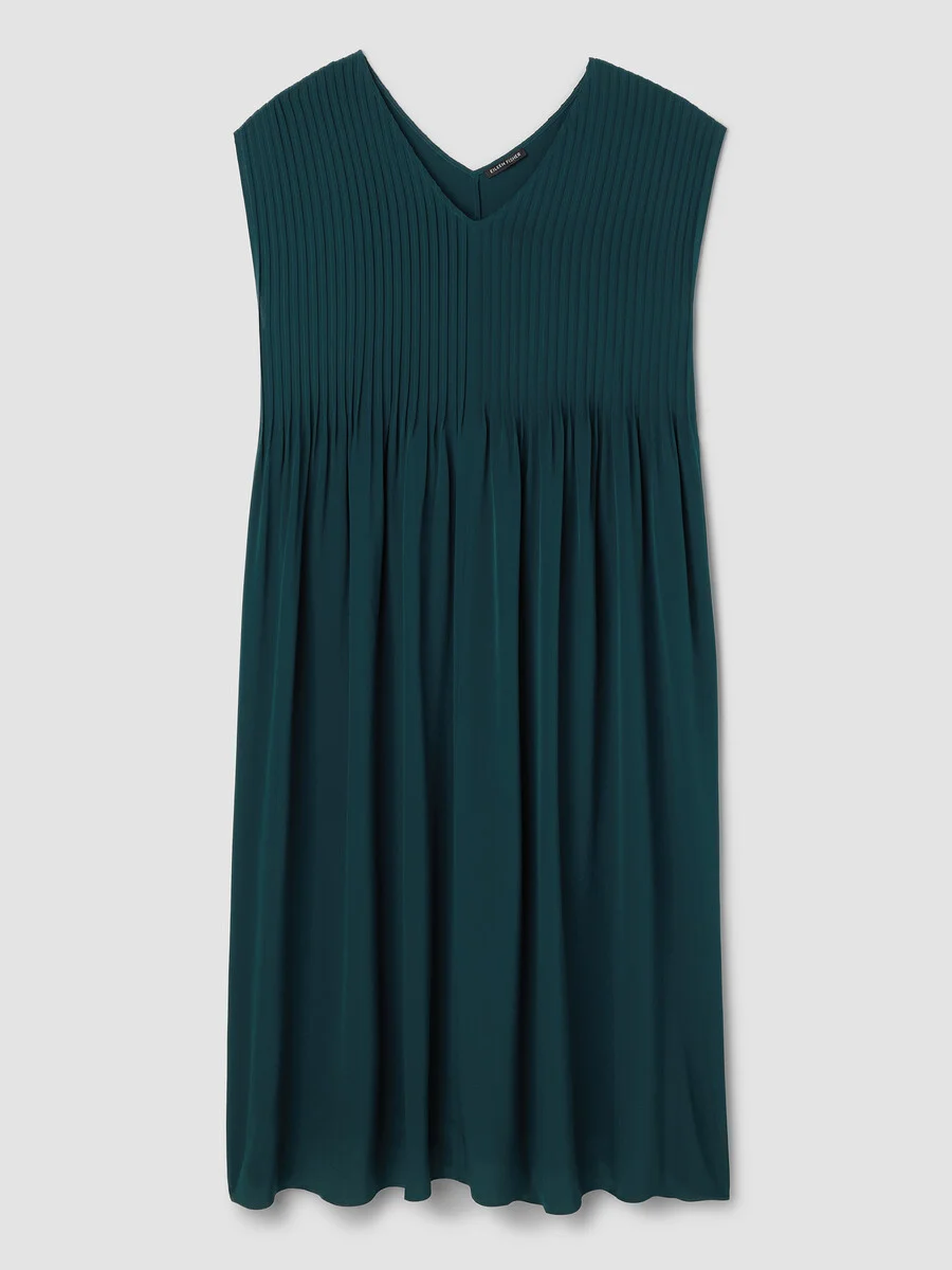 Easy and elegant. A sophisticated V-neck dress elevated by front pleats, in a fluid silk weave with subtle crepe texture. Style No. S6CDQ-D5437 DESIGN - Close at the shoulders, wider at the hem. A silhouette that fits the body with ease. - Only available at select EILEEN FISHER stores. - Ravyanshi is 5'8" and wears a size S in Kelp, which measures 51 inches on the body. Nina is 5'3" and wears a size PS in Kelp, which measures 47 inches on the body. Christina is 5'10" and wears a size 1X in Kelp, which measures 52 1/2 inches on the body. - V-neck, cap sleeves. - Pleats at torso. - Center front and back seams. - Lined with a viscose cami slip that measures 40 inches on the body. - Style No. S6CDQ-D5437 FABRIC - Fine silk that's woven with subtle crepe texture so it reflects the light. Fluid and naturally resilient. - Hand wash cold. Line dry. - Made in China. 100% Silk. SUSTAINABILITY - This fabric is bluesign® APPROVED. It's dyed with safer chemistry using less water and less energy, meeting the bluesign® CRITERIA.