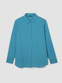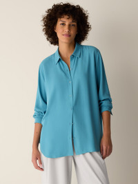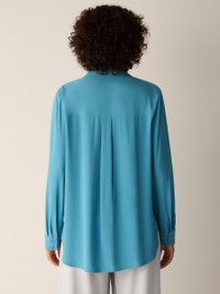 One of our most sought-after pieces of the season. The classic collar shirt with a curved hem, in our responsibly dyed silk. Even better—it's made in a Fair Trade Certified™ factory. Style No. S6GC1-T6368 DESIGN - Close at the shoulders, wider at the hem. A silhouette that fits the body with ease. - Select colors may vary by store. - Astrid is 5'9" and wears a size S in River, which measures 29 inches in front and 30 inches in back. Size 1X measures 31 1/2 inches in front and 32 1/2 inches in back. - Classic collar, button front, button cuffs with double pleat. - Back yoke with center box pleat. - Mother-of-pearl buttons. - Style No. S6GC1-T6368 FABRIC - Light, fluid and versatile. Silk with a subtly textured matte surface that we've counted on since 1999. - Machine wash cold, separately, gentle cycle. Line dry. - Made in Indonesia. 100% Silk. SUSTAINABILITY - Our Fair Trade Certified™ factories meet rigorous social and environmental standards. By choosing Fair Trade Certified™ products, you’re helping to improve the lives of workers, build resilient communities and protect the environment. - This fabric is bluesign® APPROVED. It's dyed with safer chemistry using less water and less energy, meeting the bluesign® CRITERIA.