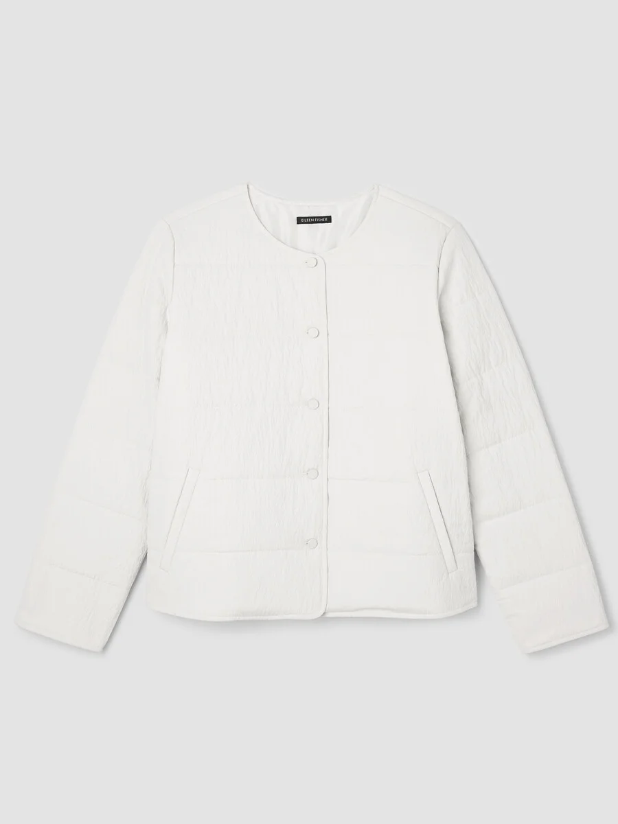 An effortless quilted jacket with recycled polyester padding that keeps warmth in—and waste out of landfills. Made in a Fair Trade Certified™ factory. Style No. F5DFJ-J5823 DESIGN - Close at the shoulders, wider at the hem. A silhouette that fits the body with ease. - Only available at select EILEEN FISHER stores. - Size S measures 24 inches on the body. Size 1X measures 26 1/2 inches on the body. - Round neck, button front, welt pockets. - Fully lined in Silk Habutai. - Style No. F5DFJ-J5823 FABRIC - We blend matte silk with recycled nylon for a subtly rippled weave that still feels smooth to the touch. With PrimaLoft™ recycled polyester fill made from plastic bottles. - Made in Indonesia. SUSTAINABILITY - Recycled nylon keeps waste out of the landfill. It's part of our commitment to changing the way clothes are made.