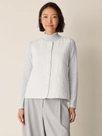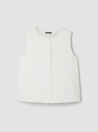 A quilted vest to elevate your layers. With recycled polyester that keeps warmth in—and waste out of landfills. Made in a Fair Trade Certified™ factory. Style No. F5DFJ-V1357 DESIGN - Close at the shoulders, wider at the hem. A silhouette that fits the body with ease. - Only available at select EILEEN FISHER stores. - Valerie is 5'9" and wears a size XS in Bone, which measures 24 inches on the body. Size 1X measures 26 1/2 inches on the body. - Round neck, button front, welt pockets. - Fully lined in Silk Habutai. - Style No. F5DFJ-V1357 FABRIC - We blend matte silk with recycled nylon for a subtly rippled weave that still feels smooth to the touch. With PrimaLoft™ recycled polyester fill made from plastic bottles. - Made in Indonesia. SUSTAINABILITY - Recycled nylon keeps waste out of the landfill. It's part of our commitment to changing the way clothes are made.