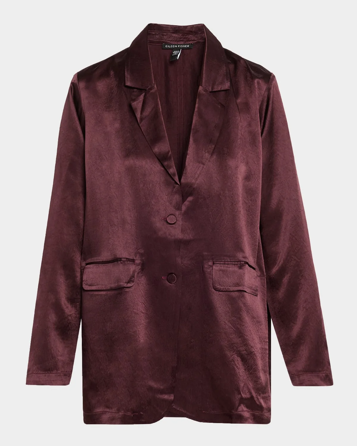 Crafted of mediumweight satin, this Eileen Fisher blazer sports a uniquely crinkled texture with high shine Made from Naia™ Renew, a cellulosic fiber produced in part with recycled material Approx. 30"L from shoulders to hem Notched lapels Singlebreasted front Long sleeves Hip flap pockets Center back slit Relaxed fit Acetate Machine wash cold Imported