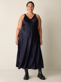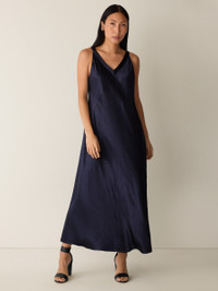 Lustrous elegance. The V-neck dress transformed by the fluid sophistication of a textured satin weave. Made in a Fair Trade Certified™ factory from Naia™ Renew cellulosic fiber produced in part with recycled material. Style No. F5SNY-D0620 DESIGN - Close at the shoulders, wider at the hem. A silhouette that fits the body with ease. - Only available online. - Bo Bay is 5'9" and wears a size XS in Ink, which measures 53 inches on the body. - V-neck, 1-inch straps. - Style No. F5SNY-D0620 FABRIC - Medium-weight satin with uniquely crinkled texture—and plenty of shine. Made from Naia™ Renew cellulosic fiber produced in part with recycled material, helping keep waste out of landfills. - Machine wash cold. Tumble dry low. - Made in Indonesia. 100% NaiaTM Acetate. SUSTAINABILITY - Our Fair Trade Certified™ factories meet rigorous social and environmental standards. By choosing Fair Trade Certified™ products, you’re helping to improve the lives of workers, build resilient communities and protect the environment. - This fabric is bluesign® APPROVED. It's dyed with safer chemistry using less water and less energy, meeting the bluesign® CRITERIA.